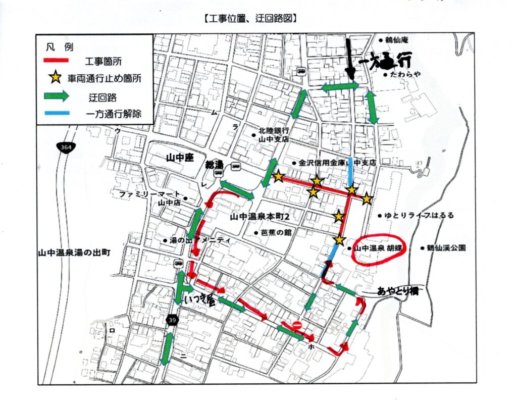 当館前は一方通行となっており、当館手前で交通規制がございますため大きく迂回していただくことになります。