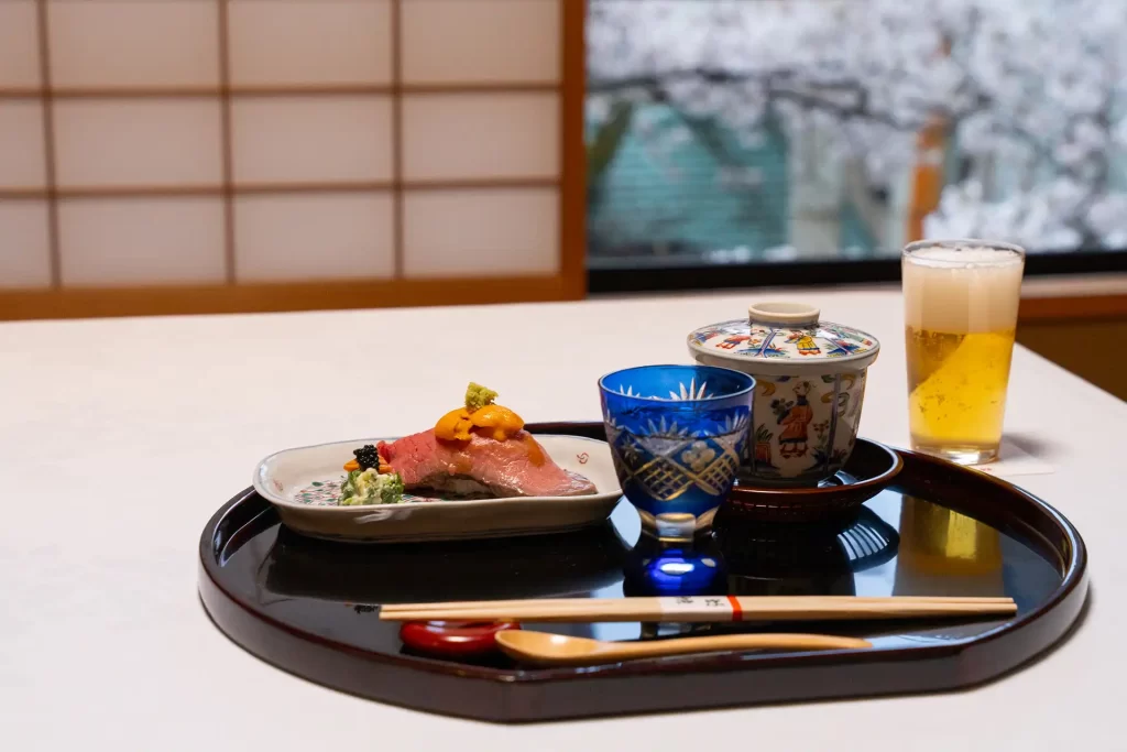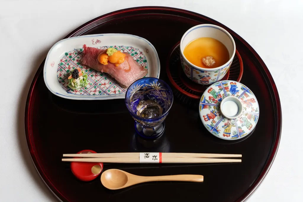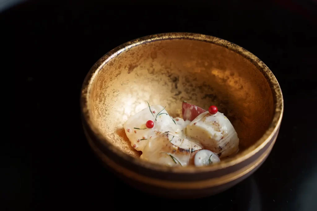 この土地で古くから伝わる食材を大切に、旅人に土地の「らしさ」を「食」というツールで味わっていただきたい。 そこには感動があり出会いがあり…そして安心感が備わってきます。 加賀の地に昔から伝わる郷土料理や調理技法を用い懐石料理の中に加え、また、 加賀の地独特の器「九谷焼」、「山中漆器」を随所に使う、お料理と器を楽しんでいただいております。